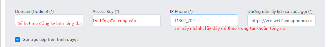 B1: Liên hệ đội kỹ thuật của VCC - Vinaphone để được cung cấp các thông tin tích hợp tổng đài