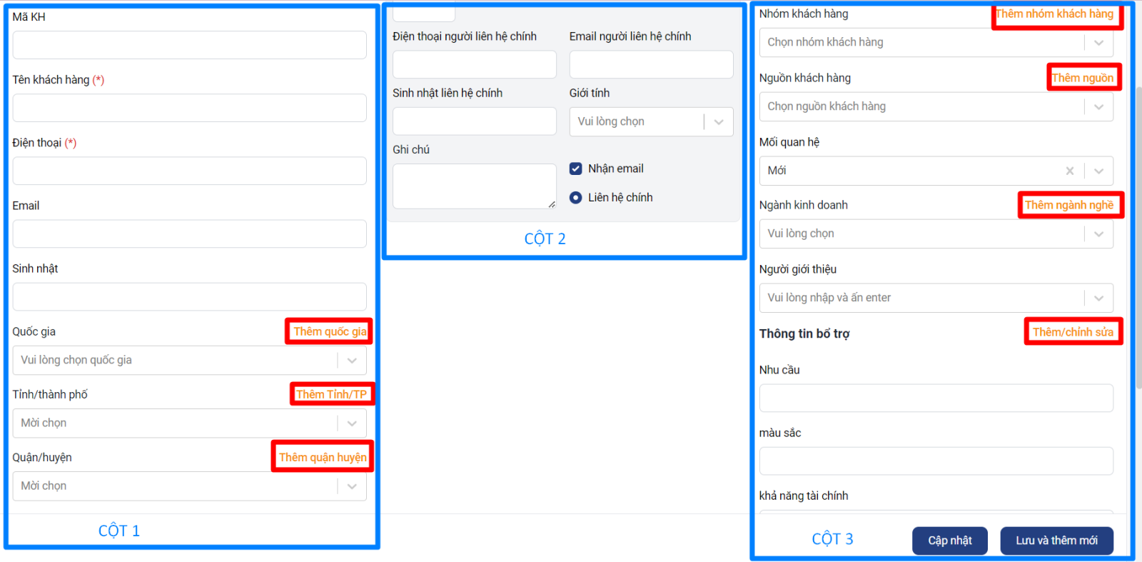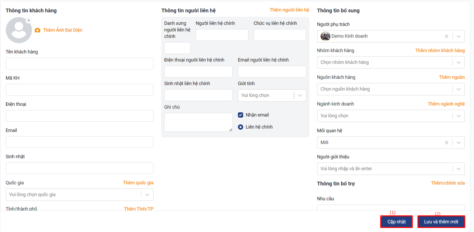 (2): Anh/ chị dùng phần lưu và thêm mới khi anh chị cập nhật nhiều khách hàng. Khi anh/chị chọn vào nút lưu và thêm mới hệ thống sẽ tiếp tục hiển thị bảng để tạo khách hàng mới.