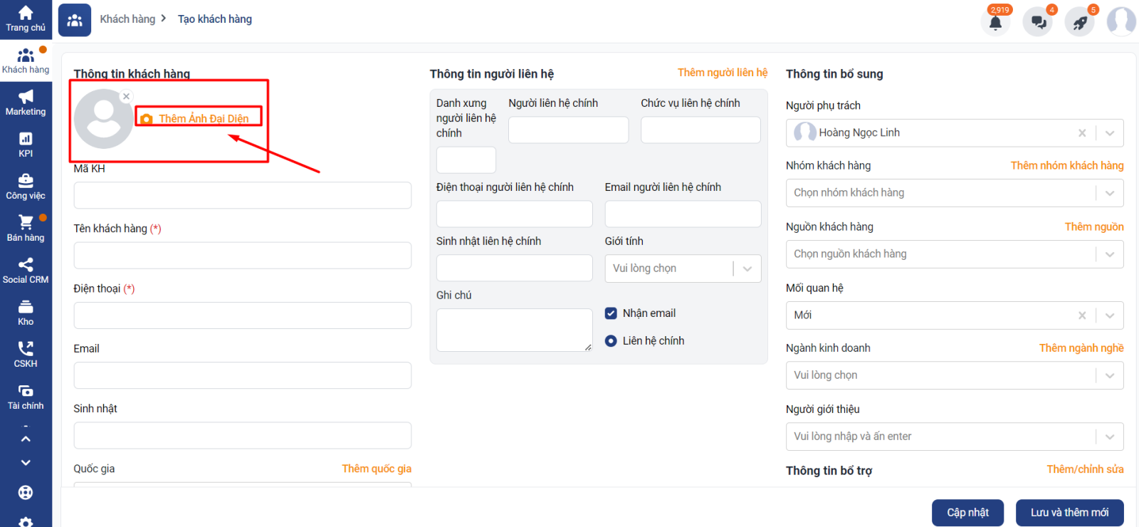 - Anh chị có thể tải ảnh avatar của khách hàng bằng cách click vào Thêm ảnh đại diện.