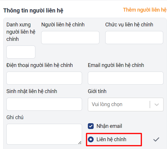 - Trong trường hợp khách hàng là công ty. Cột thông tin khách hàng anh/chị điền thông tin công ty. Cột liên hệ, anh/chị điền thông tin người liên hệ trong công ty đó. Hiện tại trên hệ thống không giới hạn số người liên hệ nhưng chỉ được chọn 1 liên hệ chính. Liên hệ chính là người anh chị thường xuyên tương tác, trao đổi trong công ty đó. Ngoài việc tương tác, liên hệ chính về chức năng của hệ thống sẽ là đối tượng mặc định khi gửi email và sms.