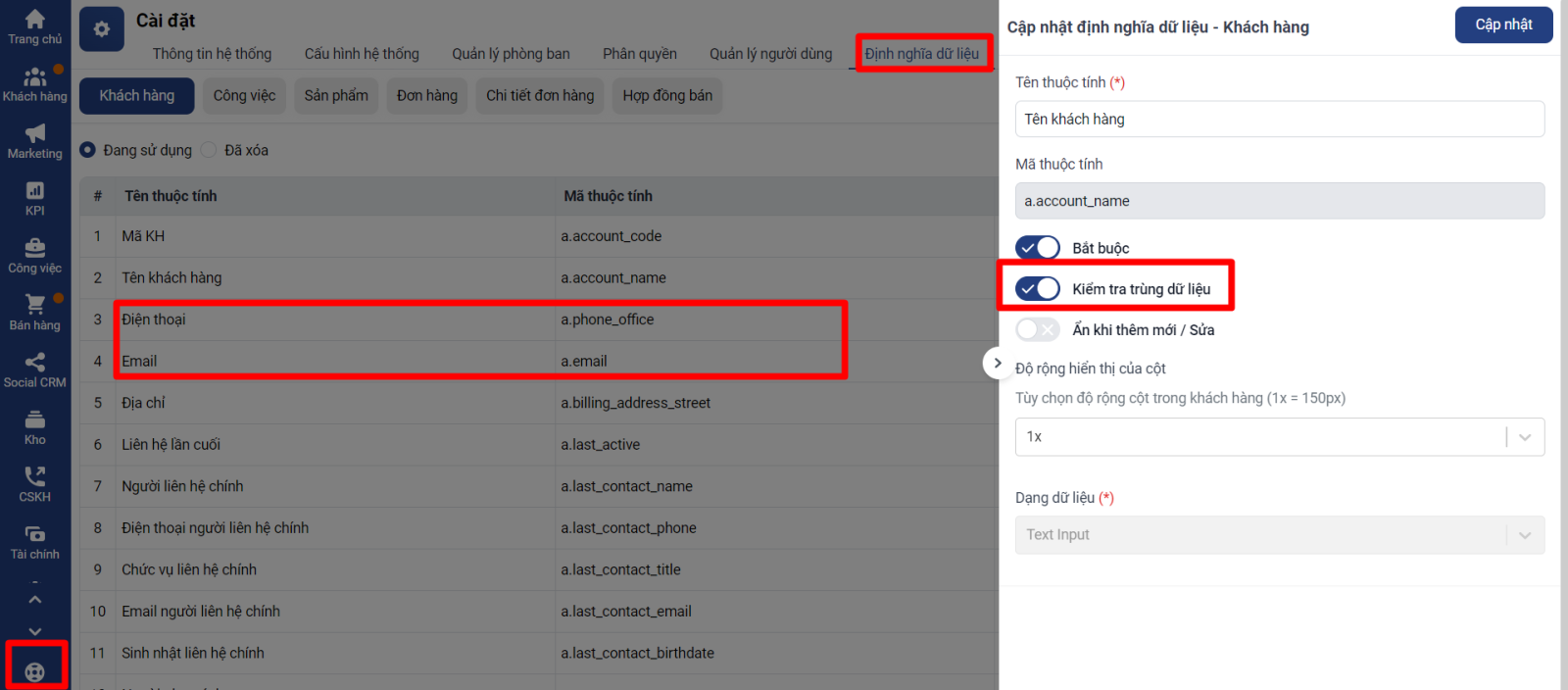 - Anh chị có thể bật check trùng email và số điện thoại để hệ thống sẽ check trùng thông tin của các khách hàng có trên hệ thống .