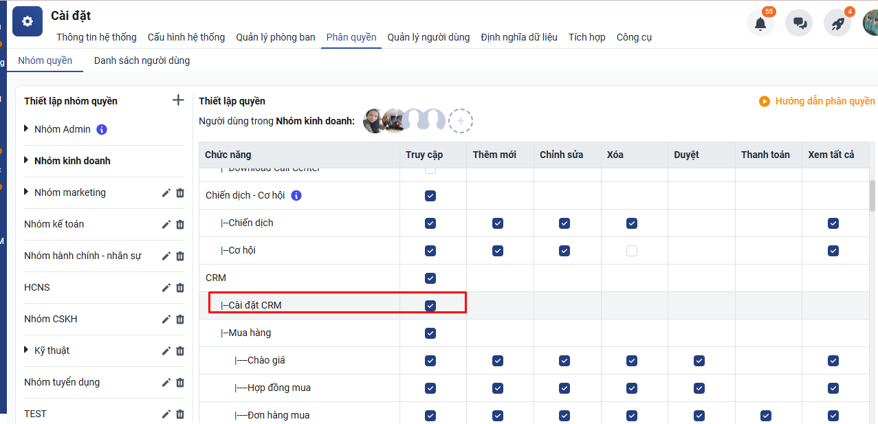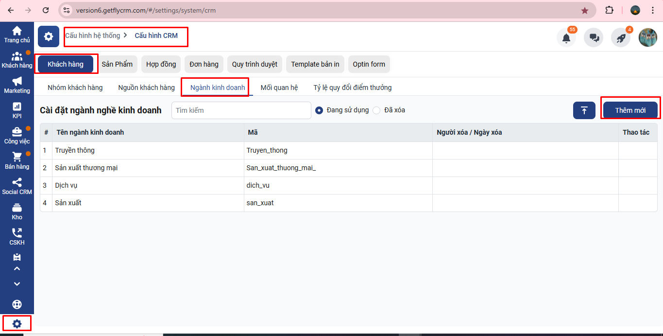 Lưu ý: Để có thể thêm mới ngành kinh doanh, các bạn phải có quyền Cài đặt CRM mới có thể truy cập để thêm mới ngành kinh doanh
