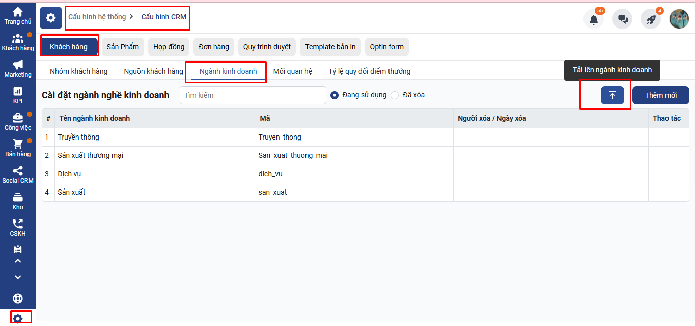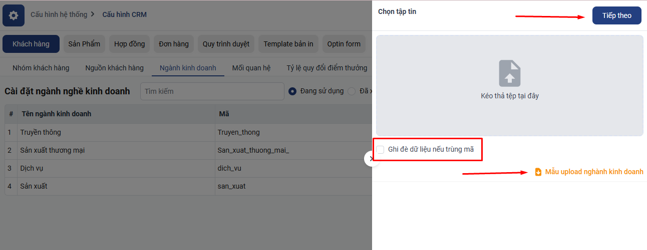 Các bạn Truy cập vào Cài đặt -> Cấu hình hệ thống -> Cấu hình CRM -> Khách hàng -> Ngành kinh doanh => Ấn vào biểu tượng Tải lên ngành kinh doanh