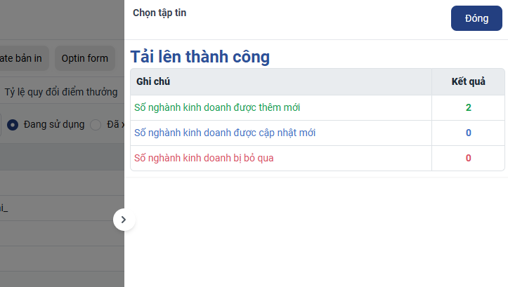 Điền các thông tin vào file excel và upload lên hệ thống, tích chọn ghi đè nếu trùng mã ngành kinh doanh đã có trên hệ thống và ấn Tiếp theo để tải lên