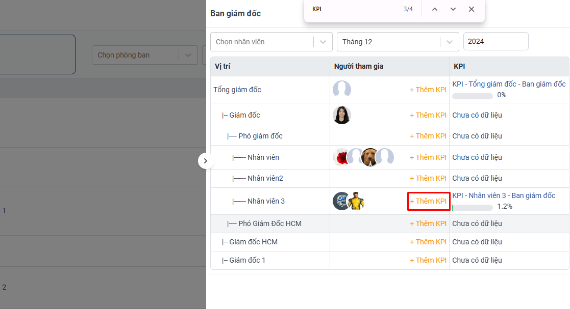 + Vào mục KPI → Danh sách → Thêm KPI cho bạn nhân viên
