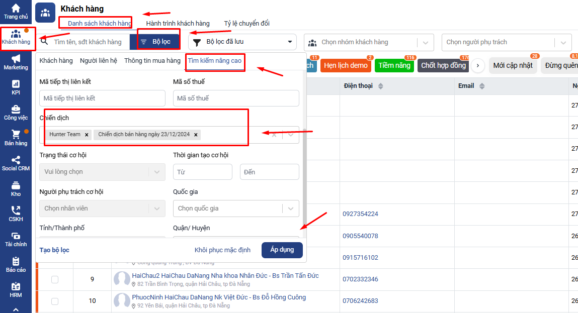 - Khách hàng → Danh sách khách hàng → Bộ lọc → Tìm kiếm nâng cao