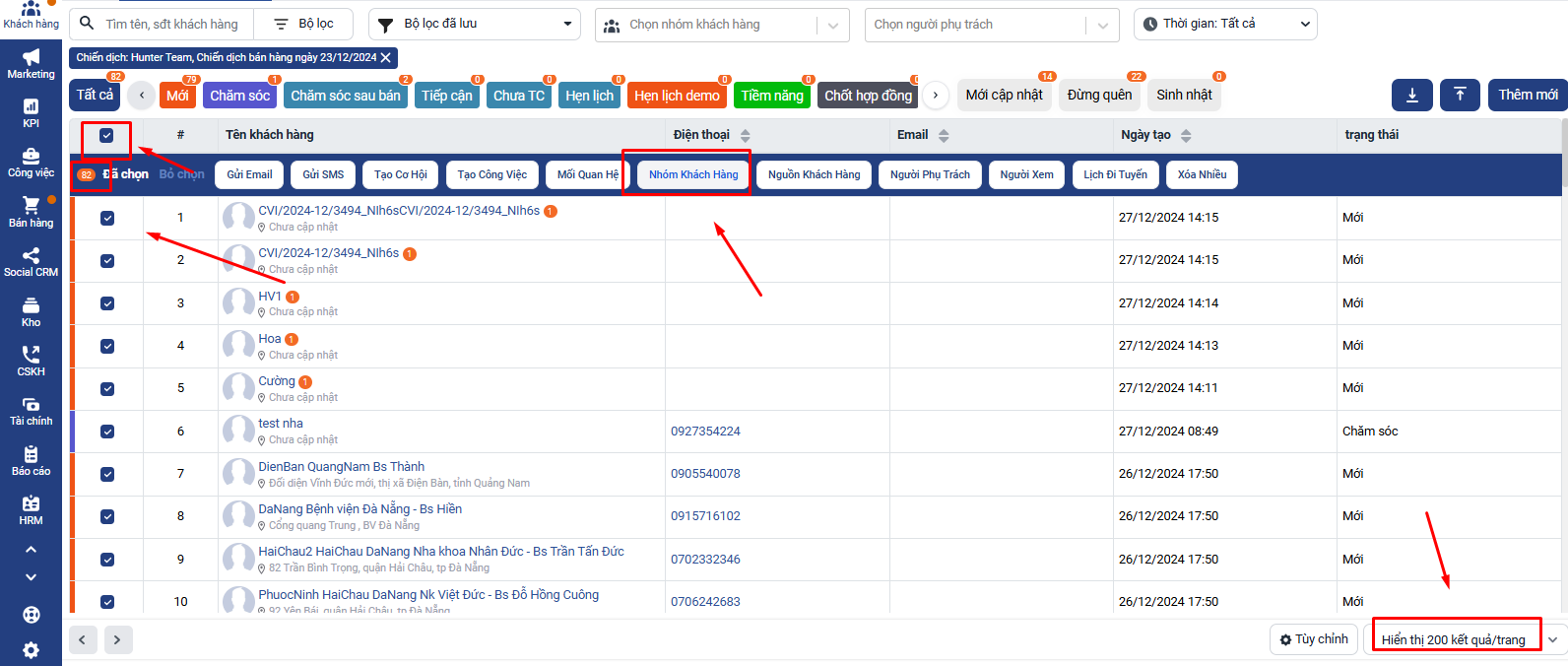 - Để hiện thị khoảng 200 kq/ trang → Tích chọn cả trang → Nhóm khách hàng