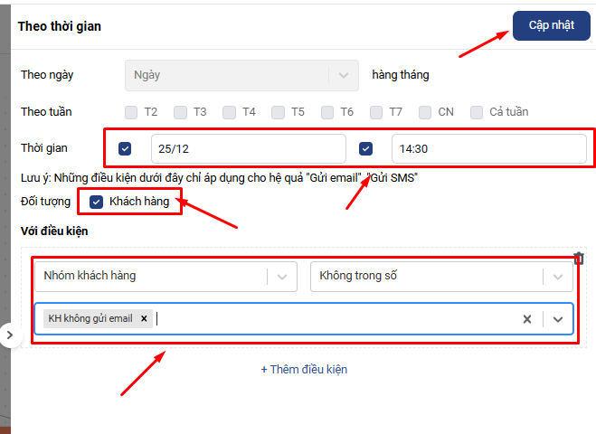 - Điều kiện: Không có sự kiện liên quan (Chọn thời gian cố định muốn gửi email; Đối tượng: Khách hàng; Nhóm khách hàng Không trong số "“KH không gửi email”)