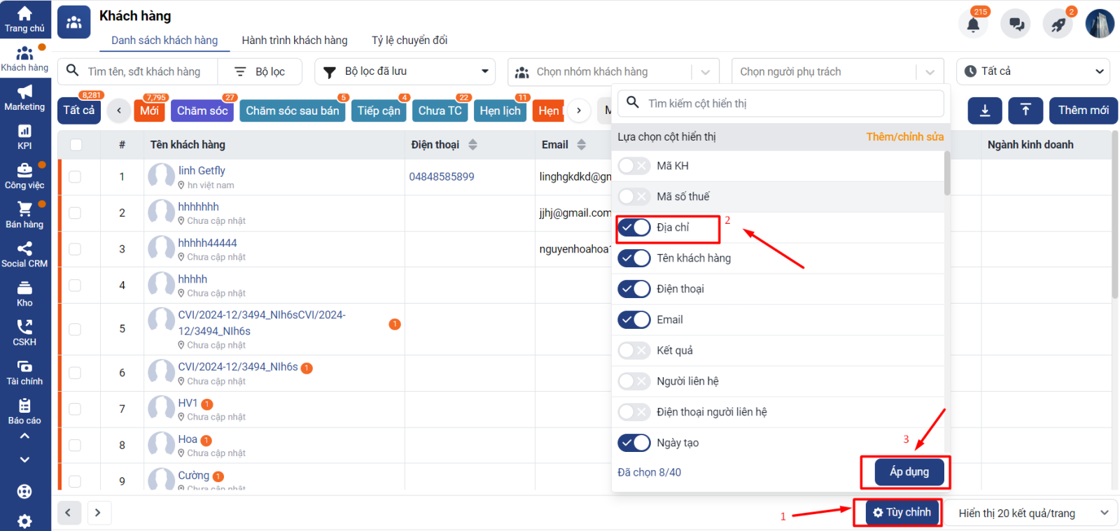 Tại trang quản lý khách hàng → Tùy chỉnh (góc phải dưới màn hình) → Bật/tắt để lựa chọn cột hiển thị → Áp dụng
