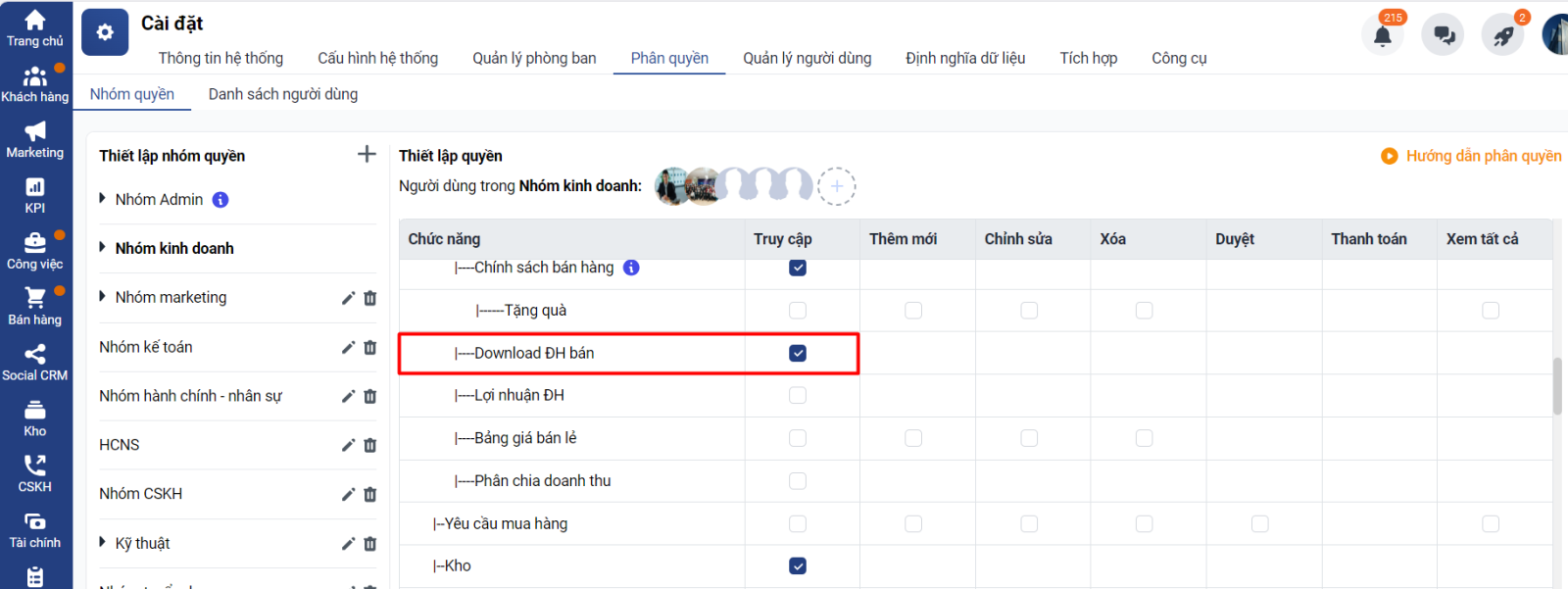 Trong bảng thiết lập phân quyền → bạn tích vào chức năng Download ĐH bán như hình ảnh
