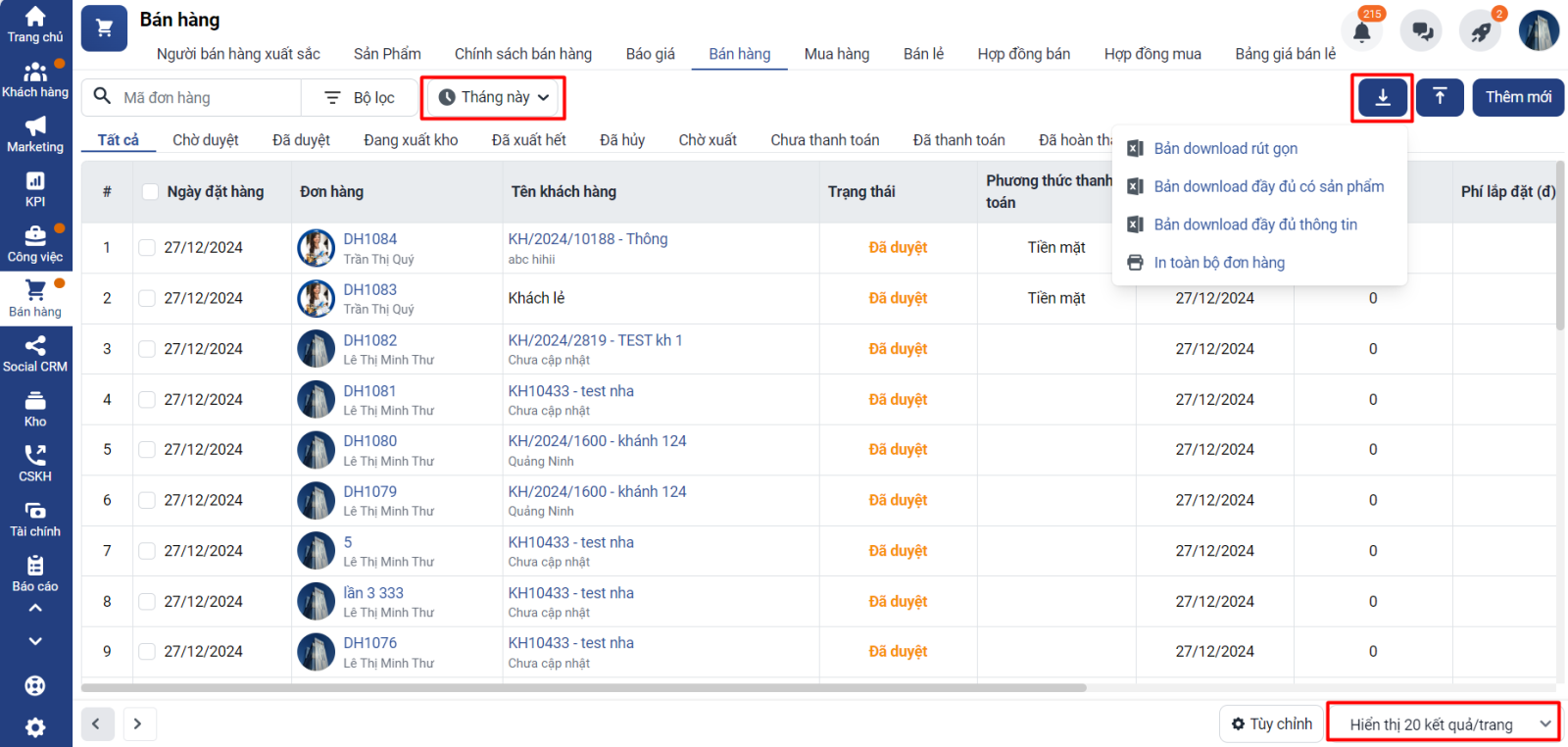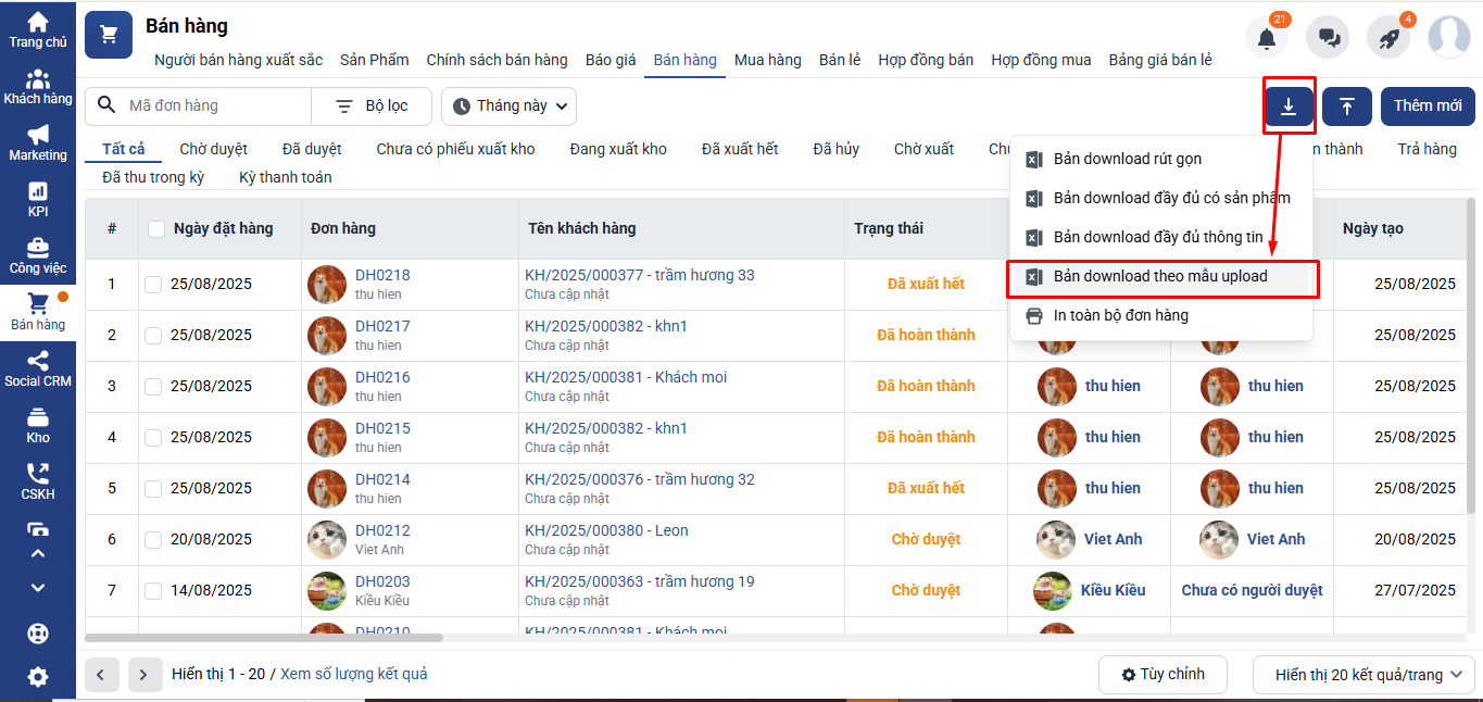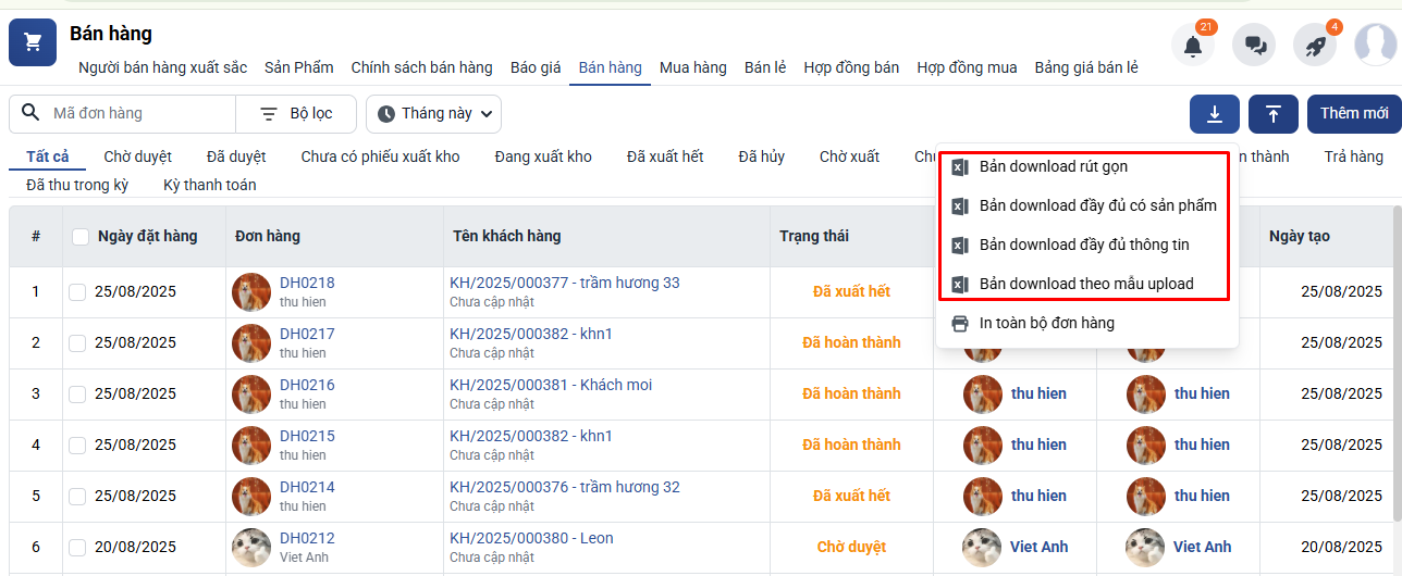 2. Thao tác tải xuống đơn hàng bán
