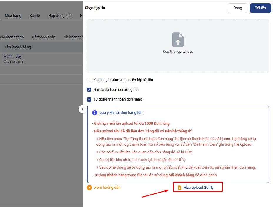 Chọn tải lên Danh sách đơn hàng → Mẫu upload Getfly
