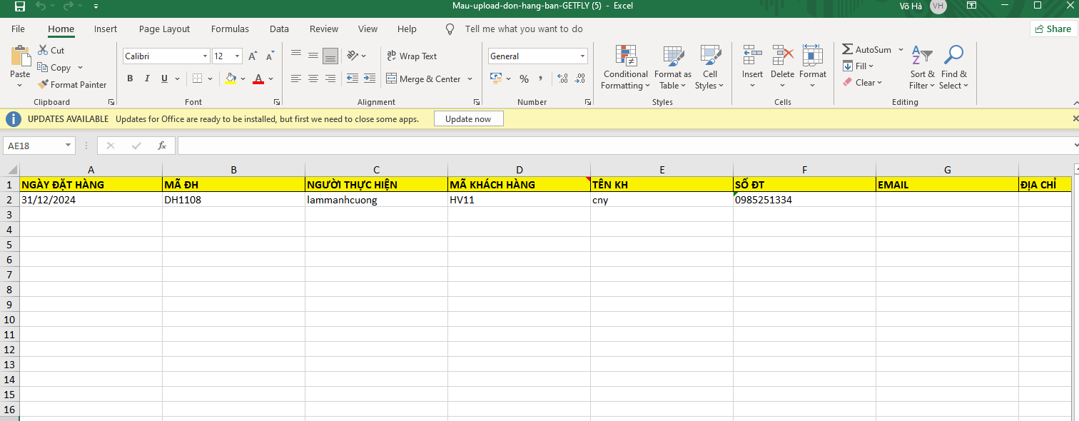 Bước 3: Sao chép các thông tin từ file download đơn hàng ở bước 1 sang file mẫu upload Getfly