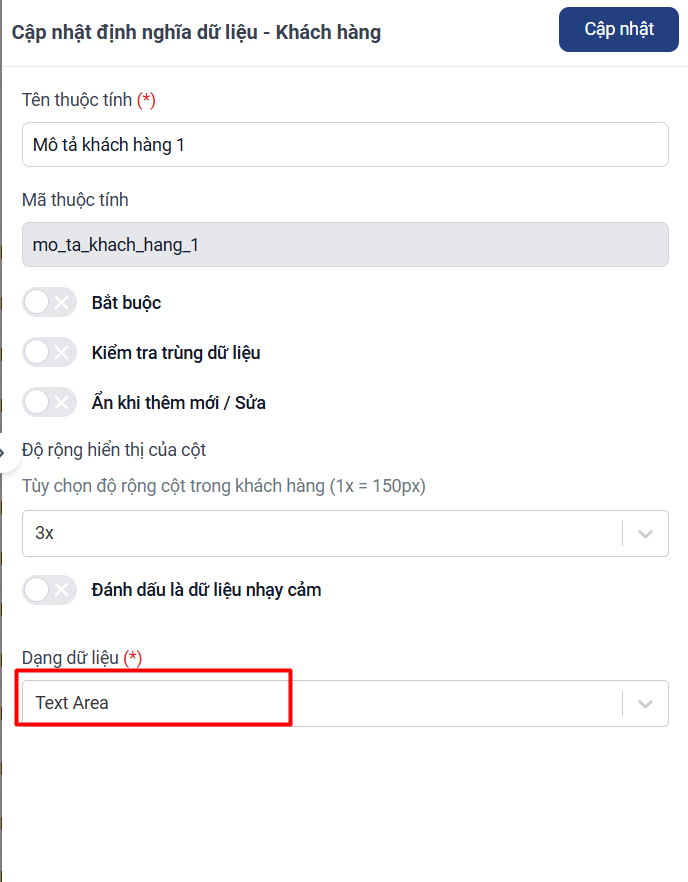 Đối với trường định nghĩa dữ liệu khách hàng tự tạo, bạn muốn nhập thông tin và có thể xuống dòng được, bạn chọn dạng dữ liệu của trường này là Text Area.