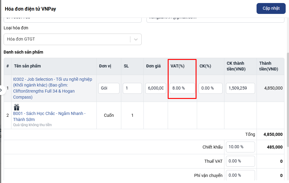 Lưu ý khi lên đơn hàng và tạo hóa đơn, chỉ nhập VAT trên từng dòng sản phẩm, không nhập tổng VAT của cả đơn hàng.