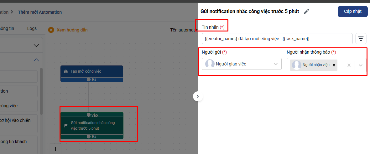 Hướng dẫn kịch bản auto gửi thông báo nhắc công việc cho nhân viên trước giờ bắt đầu công việc 5 phút
