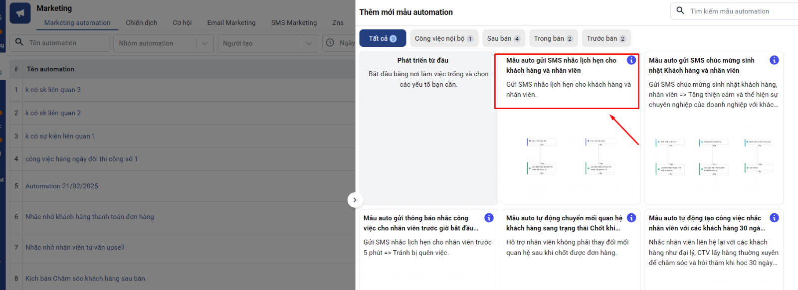 Bước 1: Marketing → Marketing Automation → Thêm mới → Chọn mẫu auto gửi SMS nhắc lịch hẹn cho khách hàng và nhân viên: