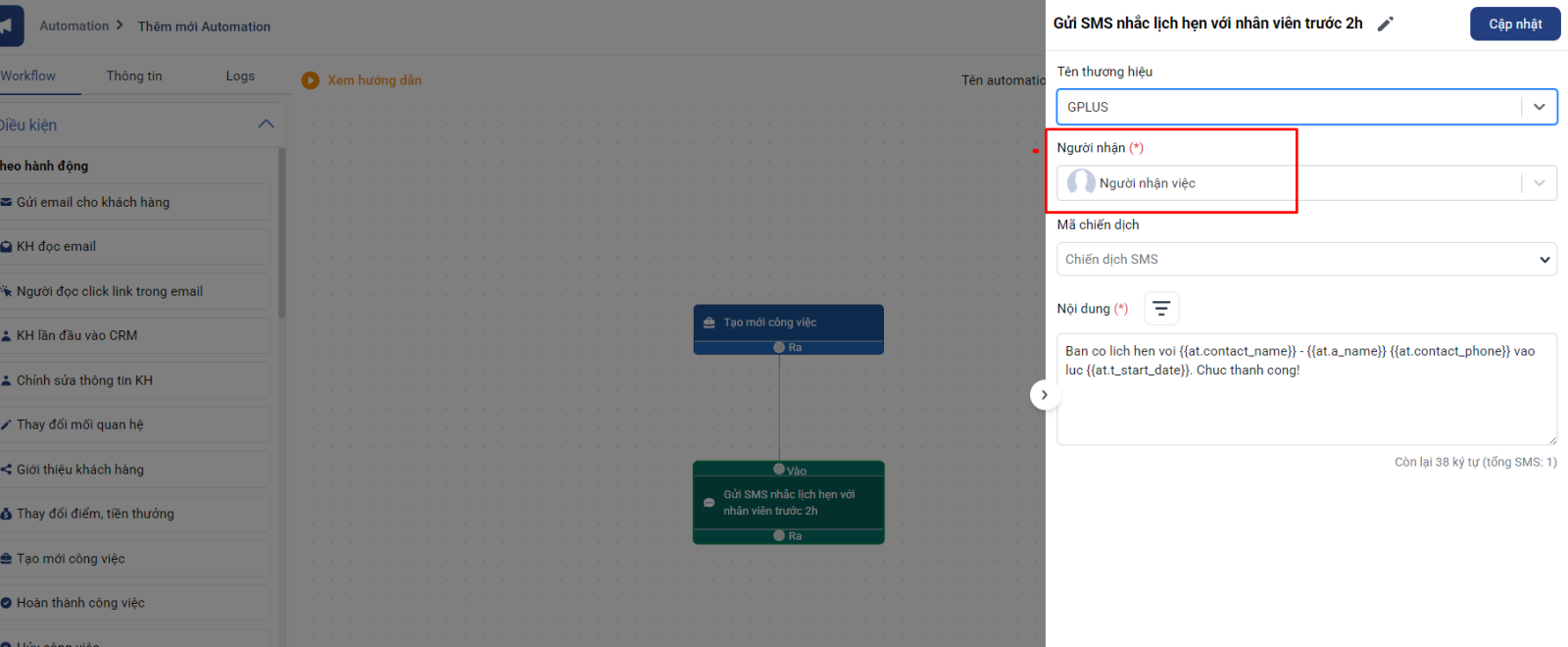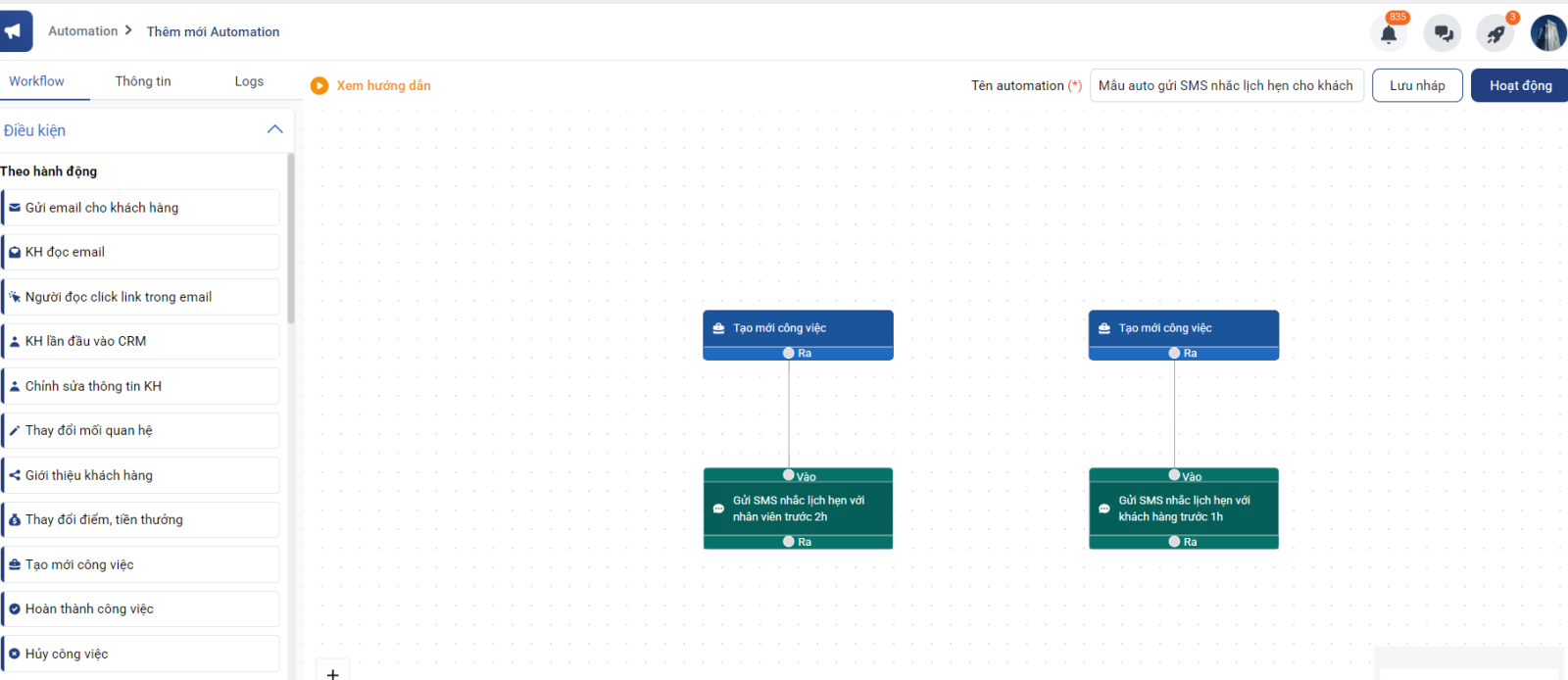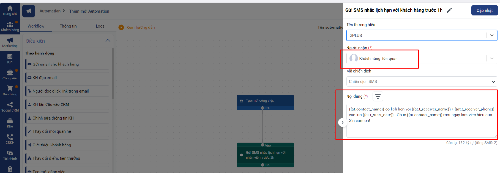 Hướng dẫn tạo automation gửi SMS nhắc lịch hẹn cho khách hàng và nhân viên