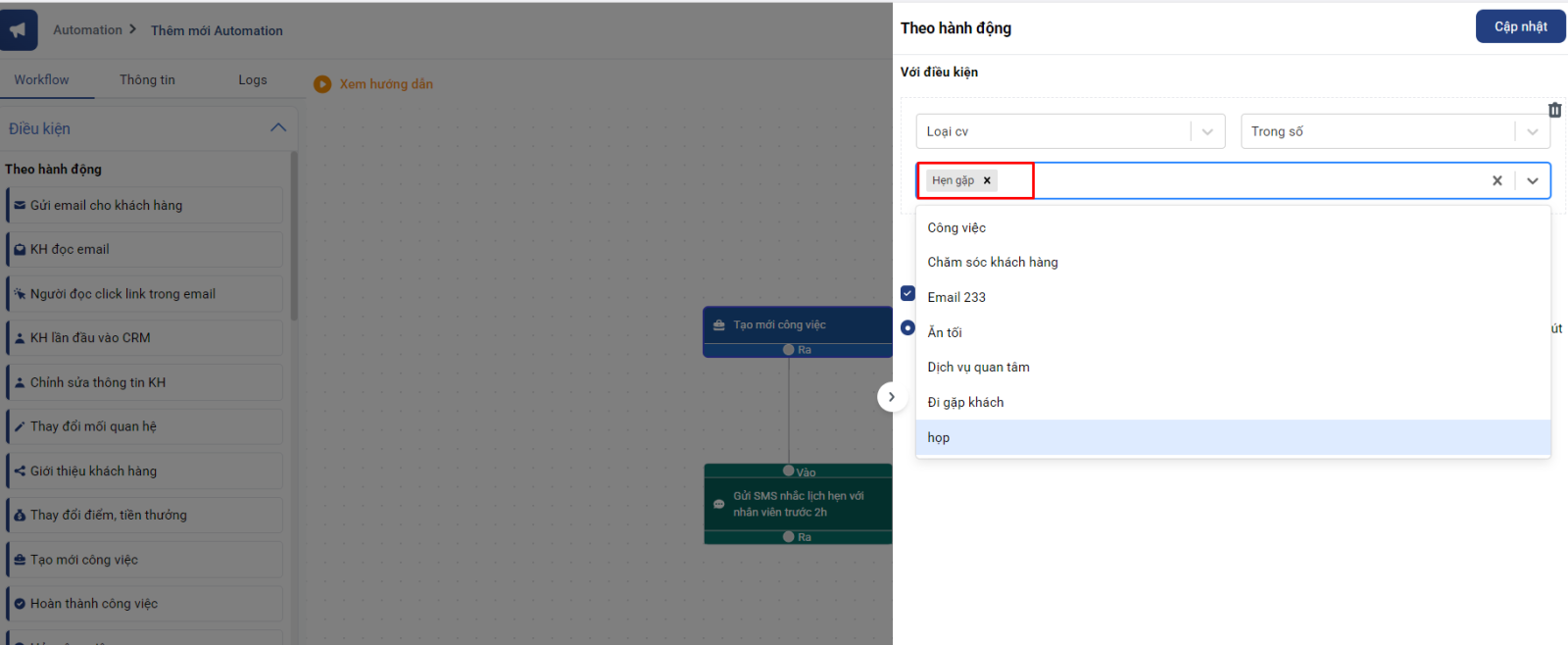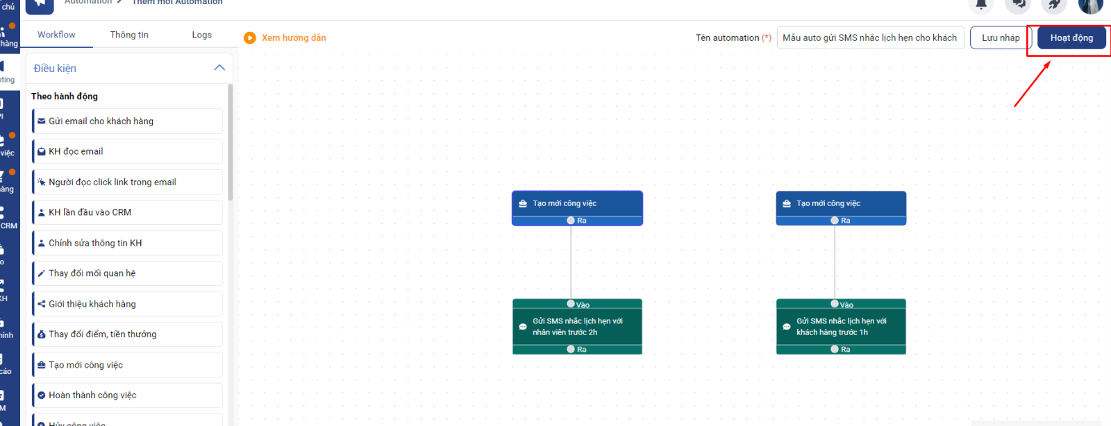 - Phần này bạn cần thiết lập 2 hành động auto là khi tạo mới công việc lịch hẹn thì sẽ gửi sms cho nhân viên và khách hàng