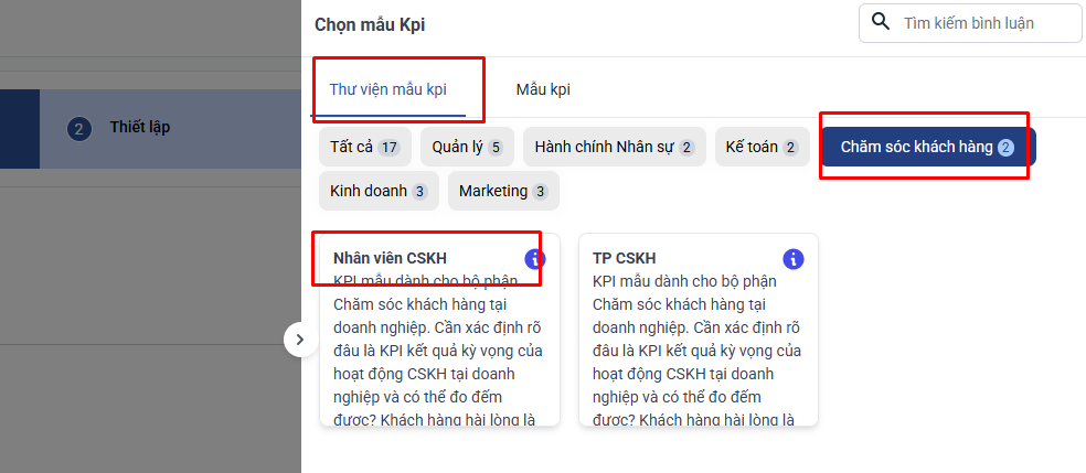 Bước 2: Bạn chọn mẫu chỉ tiêu Getfly đã thiết kế sẵn => chọn mẫu nhân viên CSKH ở Thư viện mẫu KPI Chăm sóc khách hàng