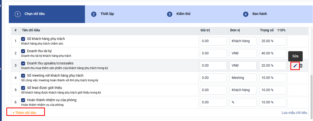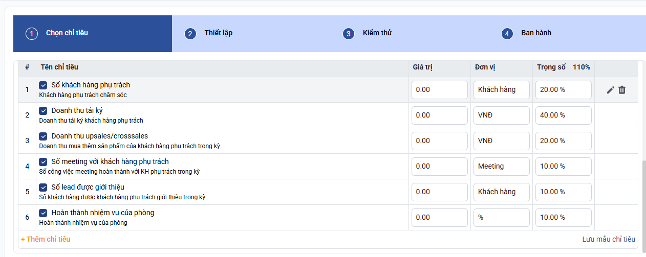 + Lưu ý: Tổng trọng số của các chỉ tiêu phải bằng 100%.