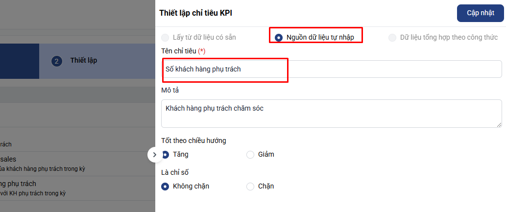 + Chỉ tiêu: Số khách hàng phụ trách: Nguồn dữ liệu tự nhập
