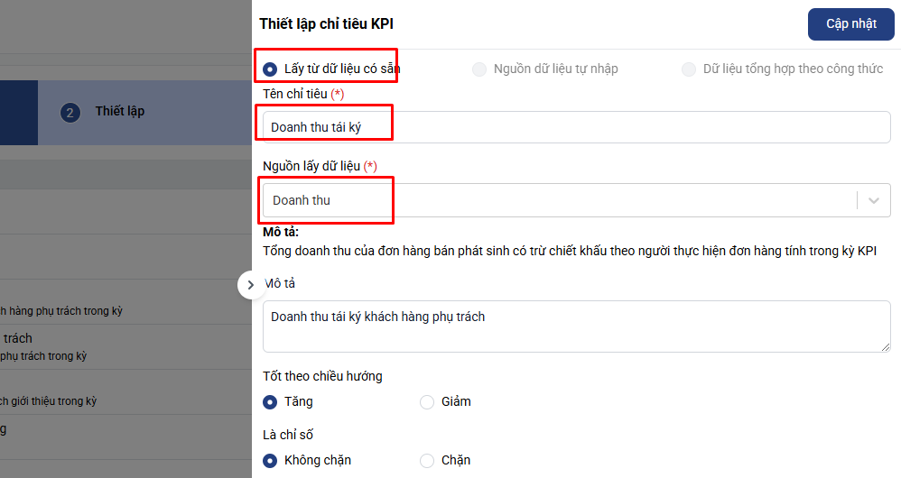 + Chỉ tiêu Doanh thu tái ký: Lấy tự động doanh thu của đơn hàng bán phát sinh có trừ chiết khấu theo người thực hiện đơn hàng tính trong kỳ KPI