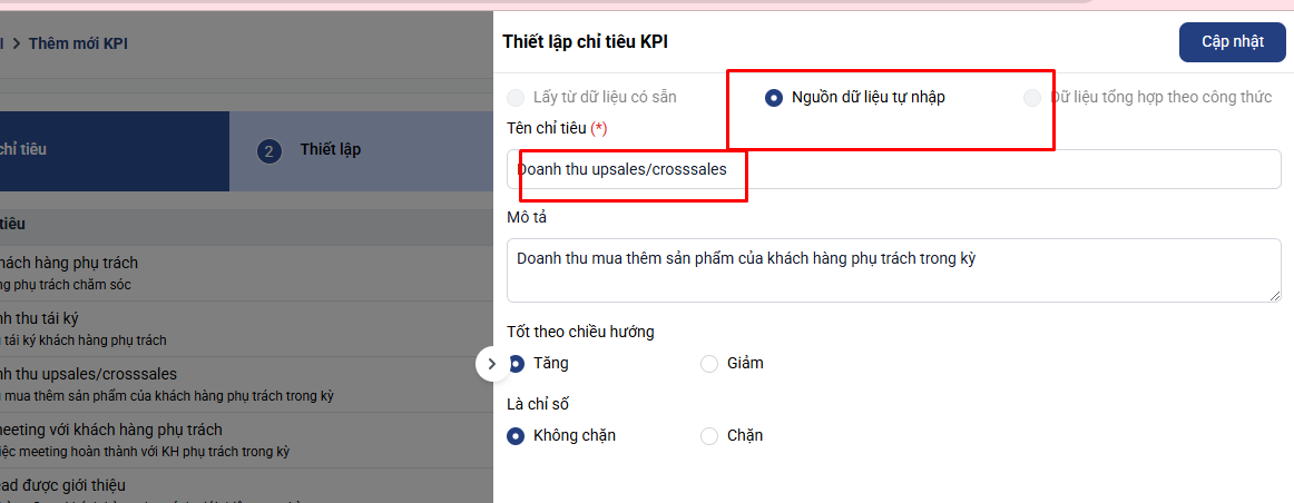 + Chỉ tiêu Doanh thu upsales/crosssales: Nguồn dữ liệu tự nhập