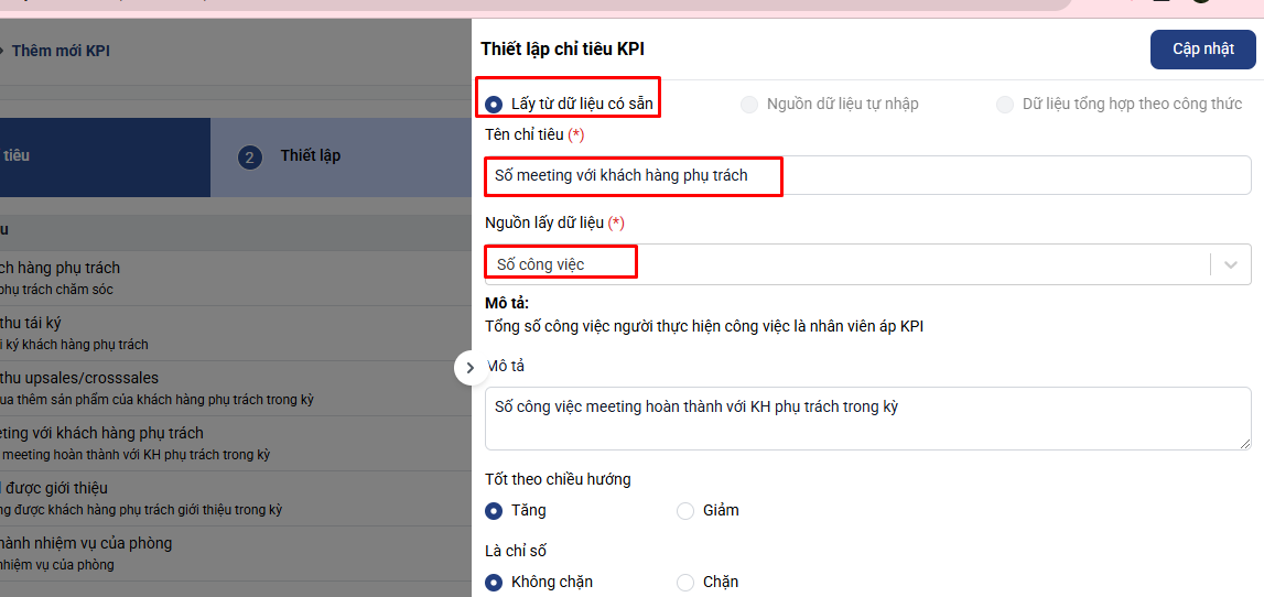 + Chỉ tiêu Số meeting với khách hàng phụ trách: Lấy tự động số công việc trên hệ thống