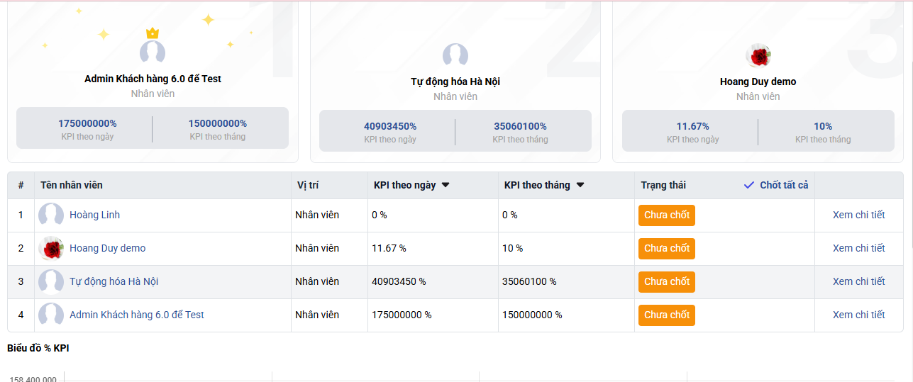 Bước 4: Tại bước này hệ thống đã tính toán số liệu dự trên chỉ tiêu kpi thiết lập để hiển thị % KPI của nhân viên CSKH