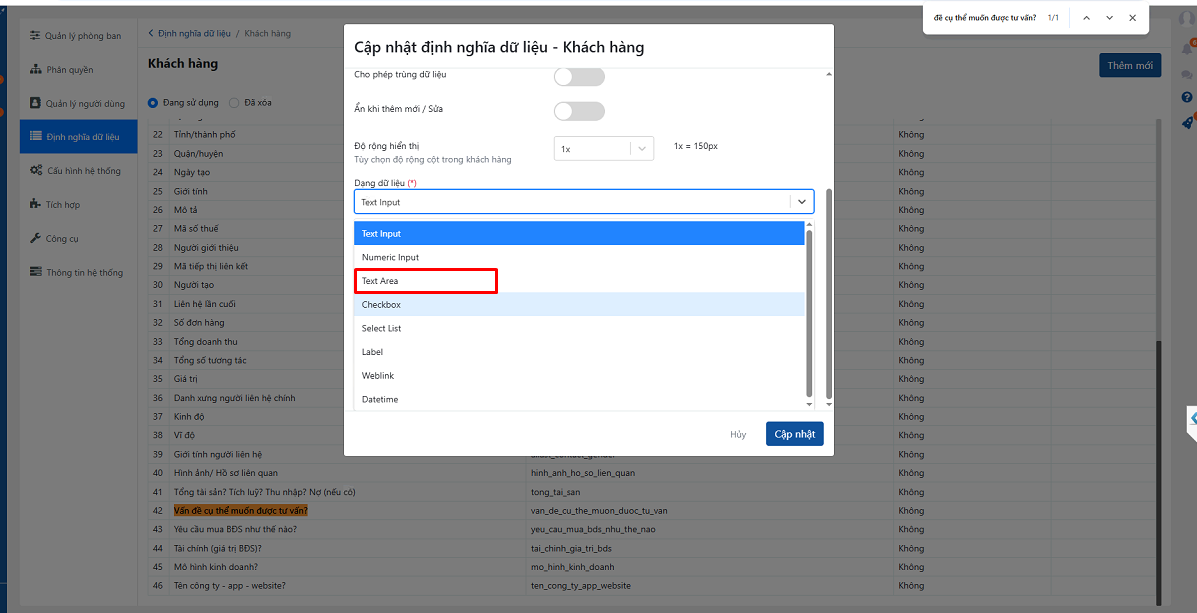 Để đảm bảo form website đổ về CRM lưu trọn vẹn thông tin, bạn cần chuyển các trường dữ liệu đang bị giới hạn từ Text Input sang Text Area. Trường dữ liệu Text Area cho phép nhập nhiều dòng, dung lượng lớn hơn và không bị cắt nội dung.