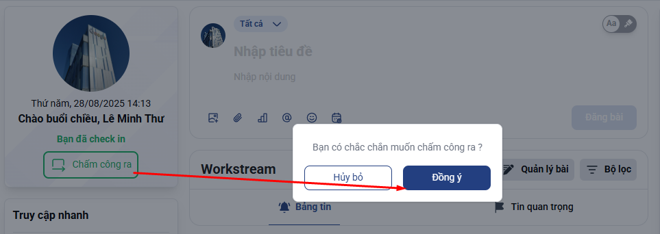 Sau khi chấm công vào sẽ hiển thị nút Chấm công ra => Hệ thống sẽ hiển thị Bạn đã Check in => Bạn ấn vào nút Chấm công ra