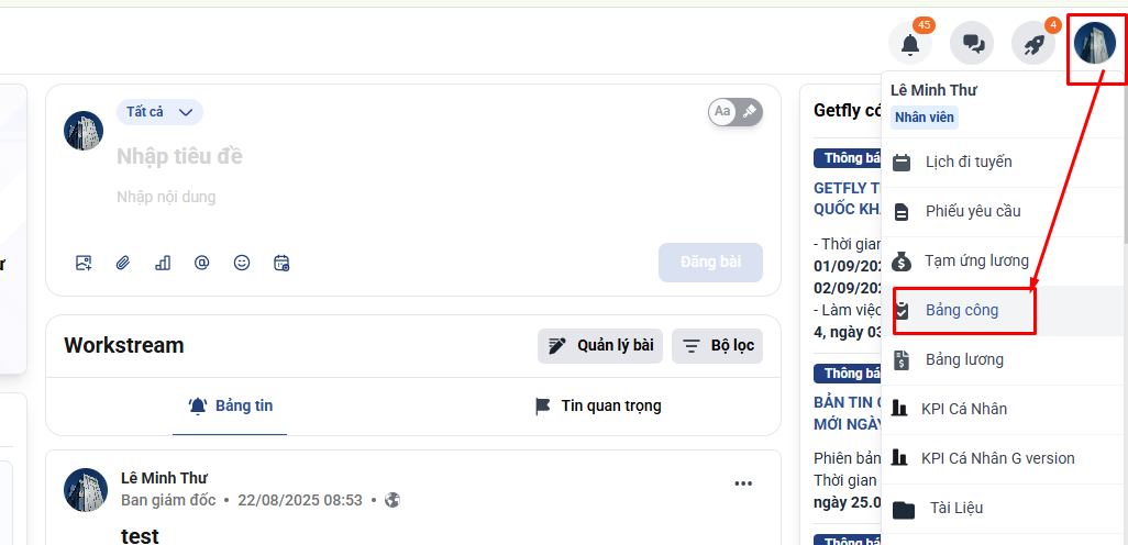 Thao tác: Nhân sự thao tác vào mục Avata cá nhân => Bảng công để theo dõi các thông tin