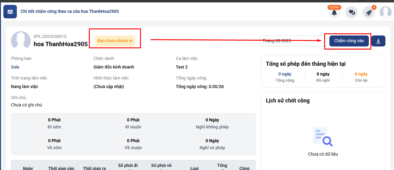+ Nếu chưa chấm công => Hệ thống sẽ báo bạn chưa check in => Bạn thao tác ấn vào nút Chấm công vào