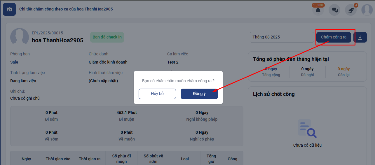 Sau khi chấm công ra sẽ hiển thị thông tin Bạn đã chấm công ra