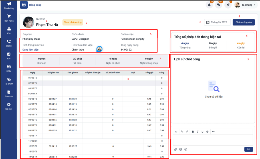 - Nếu HR ẩn nhân sự trong bảng công phòng ban → nhân sự đó không thấy bảng công cá nhân và không nhận thông báo liên quan