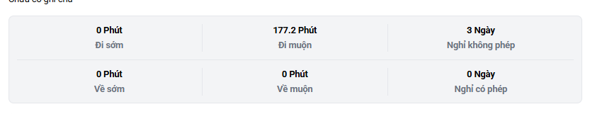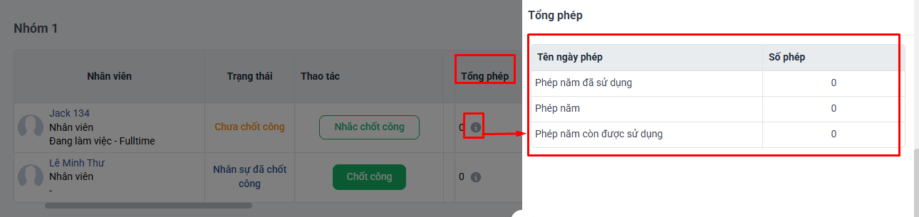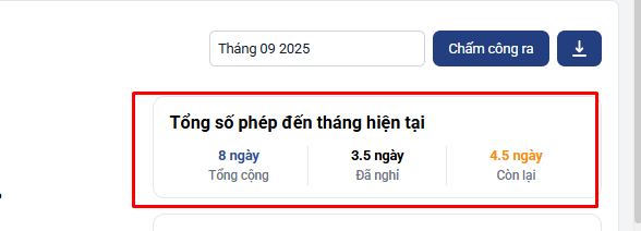 - Thông tin chấm công thực tế trong tháng. - Thống kê các loại nghỉ phép được cài đặt trên hệ thống và hiển thị số ngày nhân sự sử dụng tương ứng