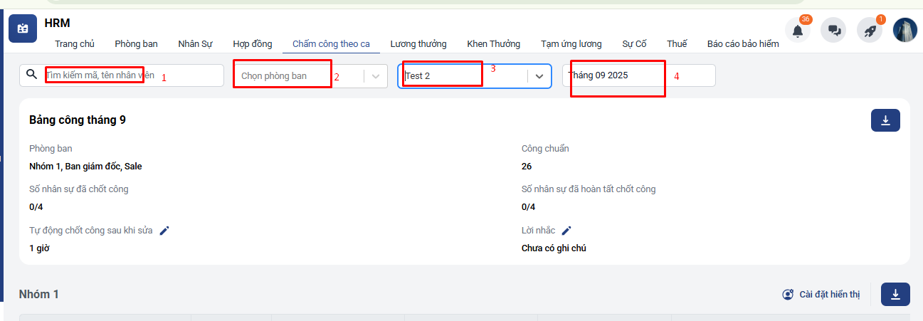 + HR có thể lọc theo: Tên nhân sự, Phòng ban, Ca làm việc, Tháng chấm công.