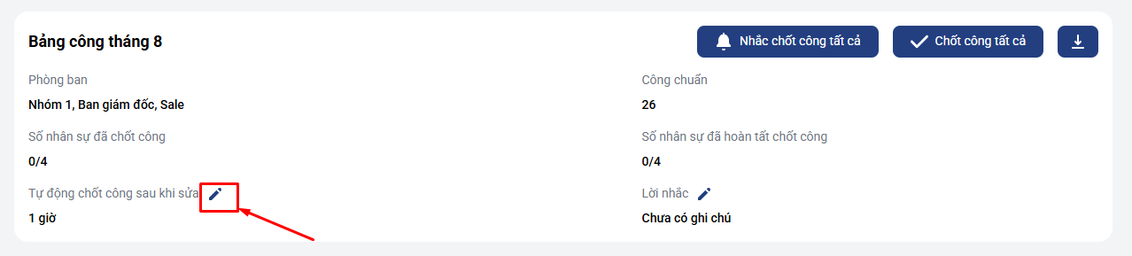 Thao tác cài đặt thời gian gian tự động chốt công, bạn click vào bút chỉnh sửa,