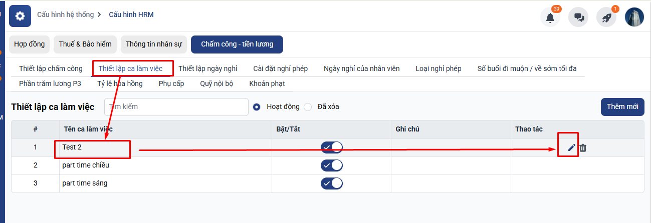 Màn hình chuyển sang phần Thiết lập ca chấm công, bạn lựa chọn ca chấm công cần sửa