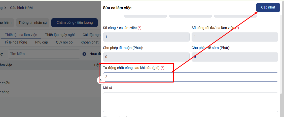 Sau đó tìm đến phần cài đặt Tự động chốt công sau khi sửa (giờ)