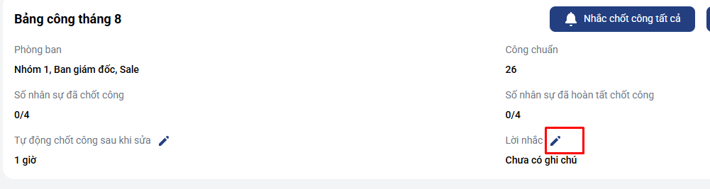 + Nút Nhắc chốt công tất cả: Khi bạn thao tác ấn vào nút Nhắc chốt công này, các tài khoản công ty trong ca chấm công sẽ nhận được 1 lời nhắc có nội dung theo ghi chú bạn đã note