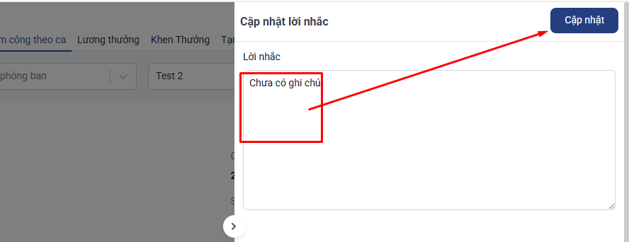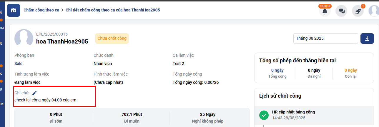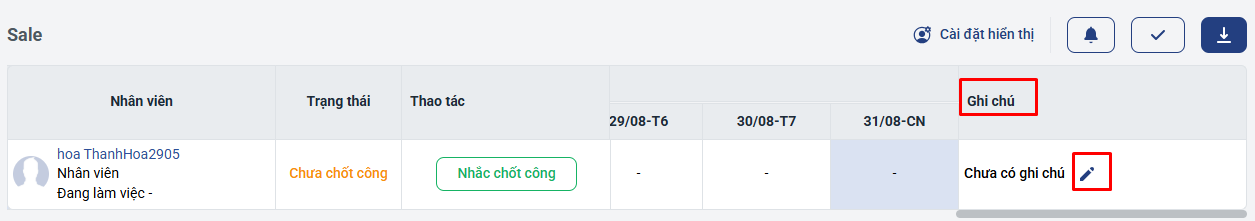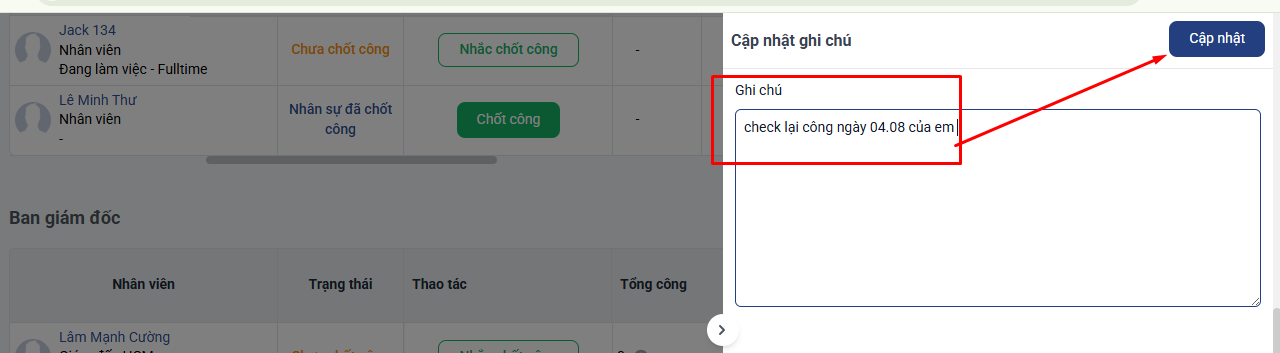 +Ghi chú: Nếu bạn thao tác ghi chú ở đây, ở bảng công của từng cá nhân sẽ theo dõi được các thông tin ghi chú cần check lại