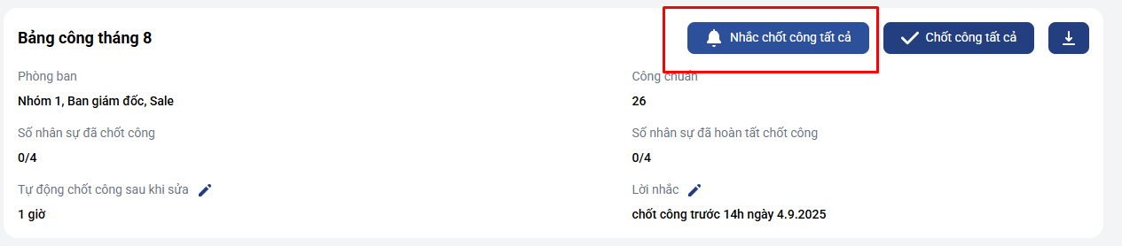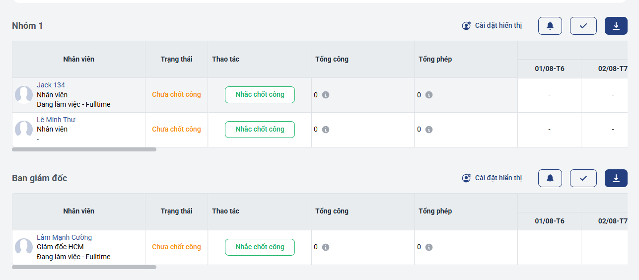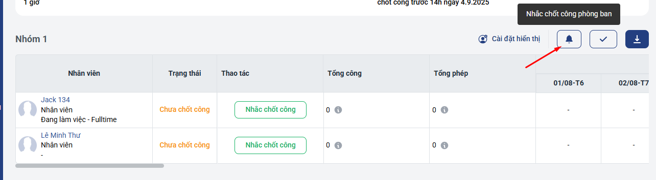 - Nhắc chốt công: hiển thị khi nhân sự chưa tự chốt bảng công của mình, hiển thị mặc định khi bảng công được tạo.