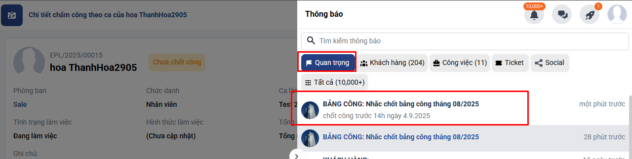 Thông báo nhắc chấm công nhân sự sẽ theo dõi ở mục Thông báo quan trọng