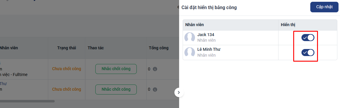 - Ẩn hiển thị cả bên bảng công cá nhân của nhân sự