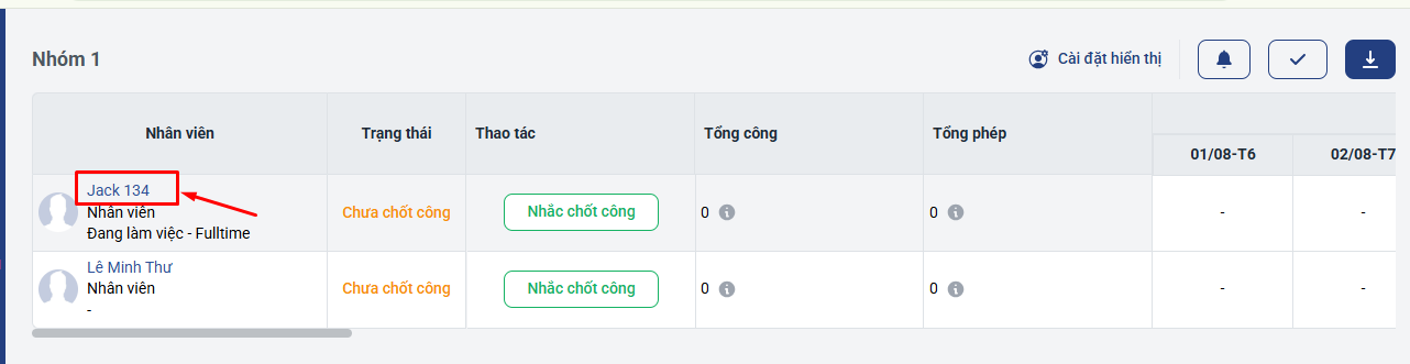 - Nếu ẩn hiển thị thì không hiển thị dòng thông tin nhân sự đó trong bảng công. Đồng thời người này không nhận được thông tin bảng công khi ấn gửi toàn bộ.