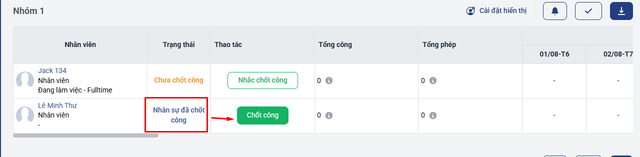- Thao tác: Nhân sự ấn chốt công, trạng thái sẽ chuyển về Nhân sự đã chốt