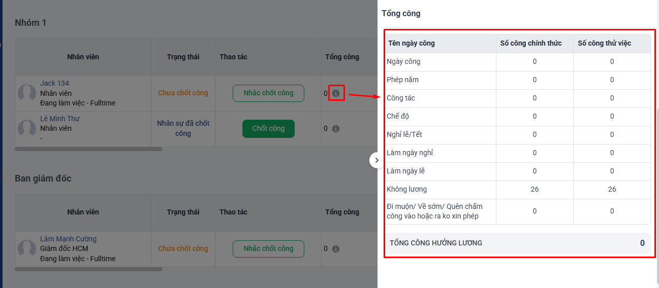 - Nhân sự nào làm chính thức sẽ hiển thị công bên cột chính thức và thử việc bên cột thử việc.