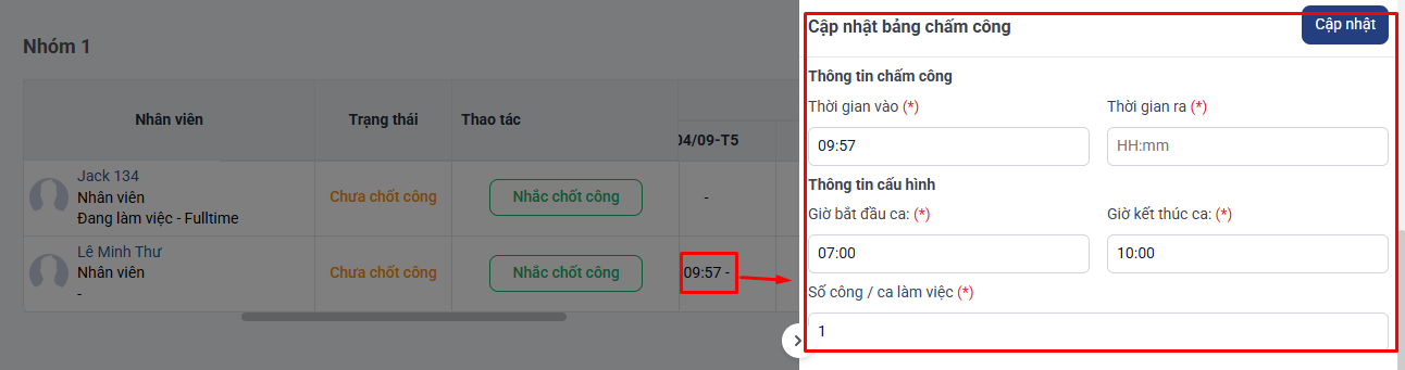 Bạn có thể sửa lại thời gian chấm công cho nhân sự